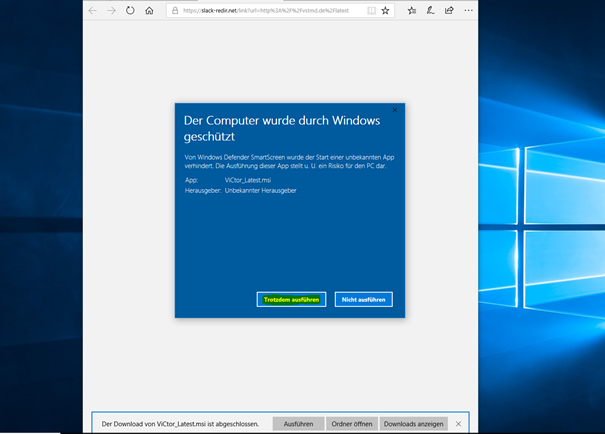 Im nächsten Schritt öffnen Sie in ihren Arbeitsplatzordner, öffnen bei „dieser Pc“ -> Desktop und klicken auf ViCtor_Latest.msi, da erscheint ein Hinweis, dass Ihr Windows Defender SmartSrceen den Start der App verhindert hat.