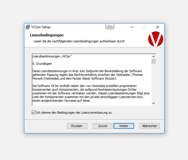 Klicken Sie auf -Weitere Informationen-, dann erscheint ein weiterer Button mit -Trotzdem ausführen- dazu erscheint ein neues Fenster, mit dem ViCtor-Setup klicken Sie auf weiter -> setzten sie ein Häkchen bei der Lizenz Vereinbarung und drücken sie wieder auf weiter.