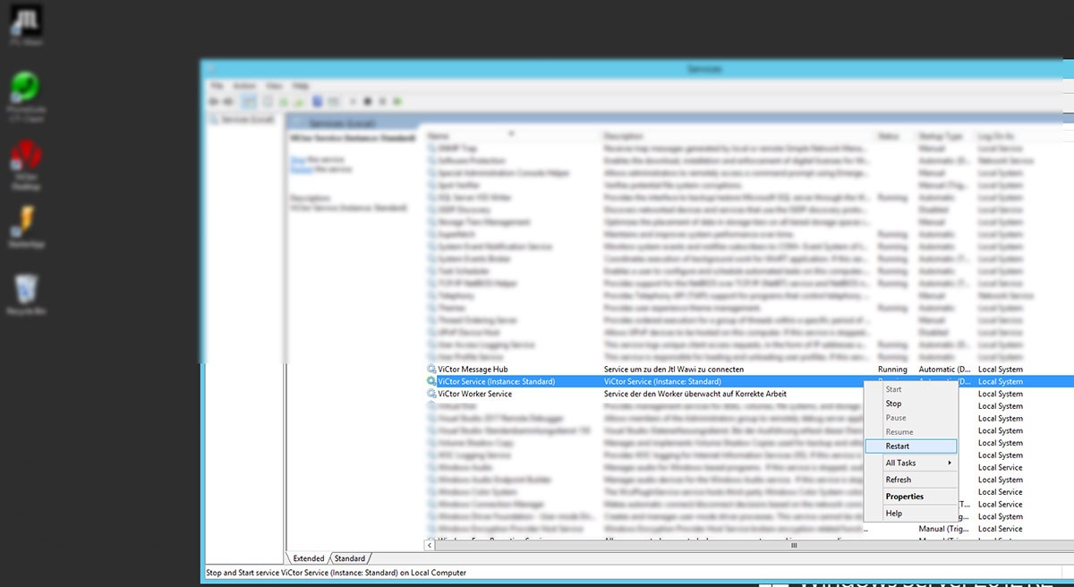 Der ViCtor Message Hub stellt die Verbindung zur Datenbank her. Der ViCtor Service ist für die Ausführung der Plugins nötig und steuert die Aufgaben der jeweiligen Module. In der Regel reicht häufig ein Neustart des ViCtor Service, damit die Plugins wieder ordentlich laufen. Da ViCtor in der Regel dauerhaft im Hintergrund arbeitet sind diese als Dienst eingerichtet. Somit sind der Message Hub und der Service in den Diensten des Computers zu finden. Zu finden sind alle Dienste unter: Systemsteuerung → Verwaltung → Dienste (Control Panel → Administrative Tools → Services). Zur Sicherheit kann auch der ViCtor Message Hub vorher neu gestartet werden.